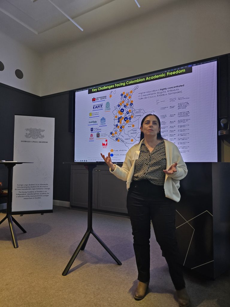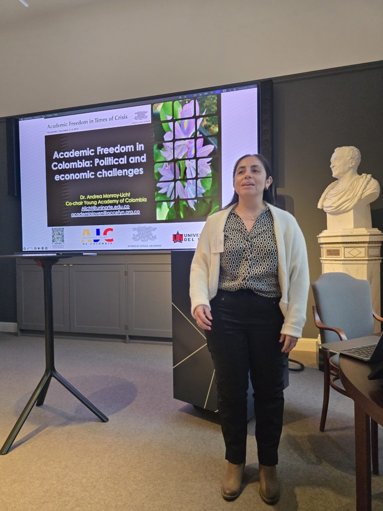En este marco, Andrea Monroy-Licht participó en el panel “Political and economic challenges”, junto con representantes de las jóvenes academias de México, Sudáfrica y Suecia. La sesión, moderada por la Young Academy of Sweden, se centró en cómo los contextos nacionales combinan presiones políticas, económicas y de seguridad que afectan el ejercicio cotidiano de la libertad académica. Su intervención, titulada “Academic Freedom in Colombia: Political and Economic Challenges, presentó tres ejes principales: el Marco normativo, las tensiones internas, las desigualdades regionales en ciencia y tecnología, y como esto se cruza con brechas en el Índice Departamental de Innovación (IDIC), así como con un presupuesto de ciencia que representa una fracción muy pequeña del Presupuesto General de la Nación, lo que agudiza la dependencia de recursos externos y agendas políticas de corto plazo. Así mismo, se mencionó como el contexto de conflicto armado y riesgos en territorio, limitan la posibilidad de elegir temas de investigación, realizar trabajo de campo o difundir resultados, lo que también afecta directamente la libertad académica.