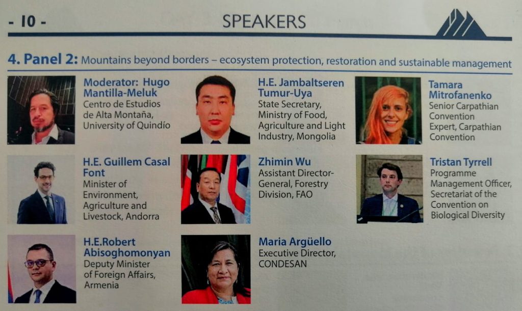 En el evento, moderó el segundo panel titulado: «Montañas más allá de las fronteras: protección, restauración y gestión sostenible de los ecosistemas», con la participación de Zhimin Wu (Subdirector General de la División Forestal de la FAO); Tristan Tyrrell (Oficial de Gestión de Programas de la Secretaría del Convenio sobre la Diversidad Biológica); María Arguello (Iniciativa Andina de Montaña); Tamara Mitrofanenko (Convenio de los Cárpatos, PNUMA); así como los Ministros de Medio Ambiente de Mongolia, S.E. J. Tumur-Uya; Andorra, S.E. G. Casal Font; y Armenia, S.E. R. Abisoghomonyan, Presidente de la COP17 del CDB.