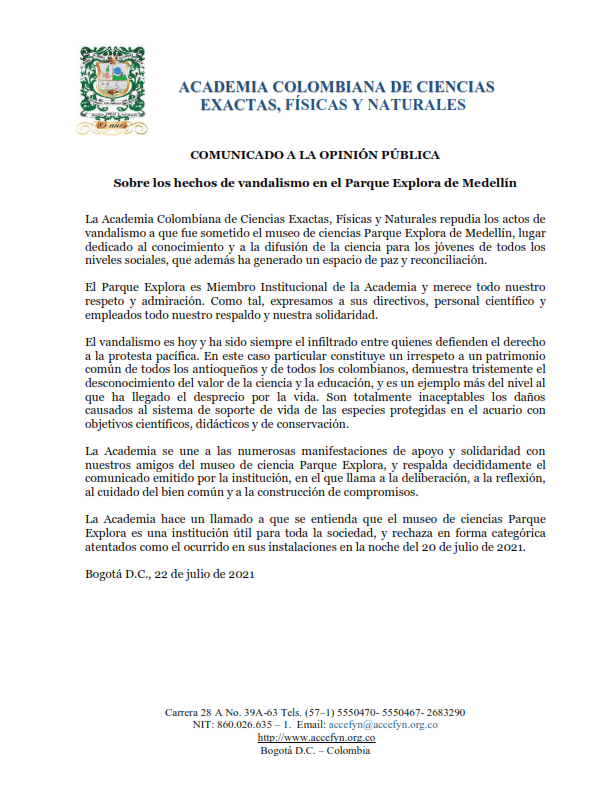 Vea el comunicado original: https://accefyn.org.co/2021/comunicados/22-julio/Parque-Explora-Comunicado_c.pdf