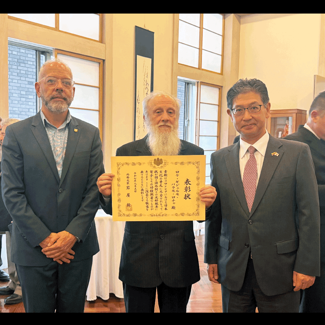 Durante el acto, el embajador Takasugi Masahiro destacó la valiosa labor del Dr. Páramo como promotor del idioma japonés y del intercambio cultural entre Japón y Colombia, reconociendo su compromiso y contribución al fortalecimiento de los lazos bilaterales.